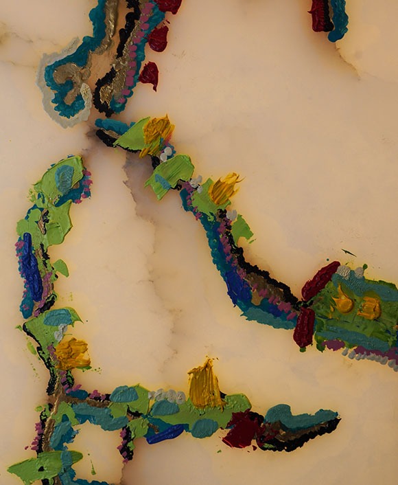La lumière ne vient pas éclairer l’œuvre : elle en émane. Filtrée par l’albâtre, elle traverse les couches de peinture et fait apparaître une profondeur intérieure. Dans cette tension entre fracture et diffusion, l’artiste propose une vision de la sérénité comme force d’équilibre face à l’adversité.