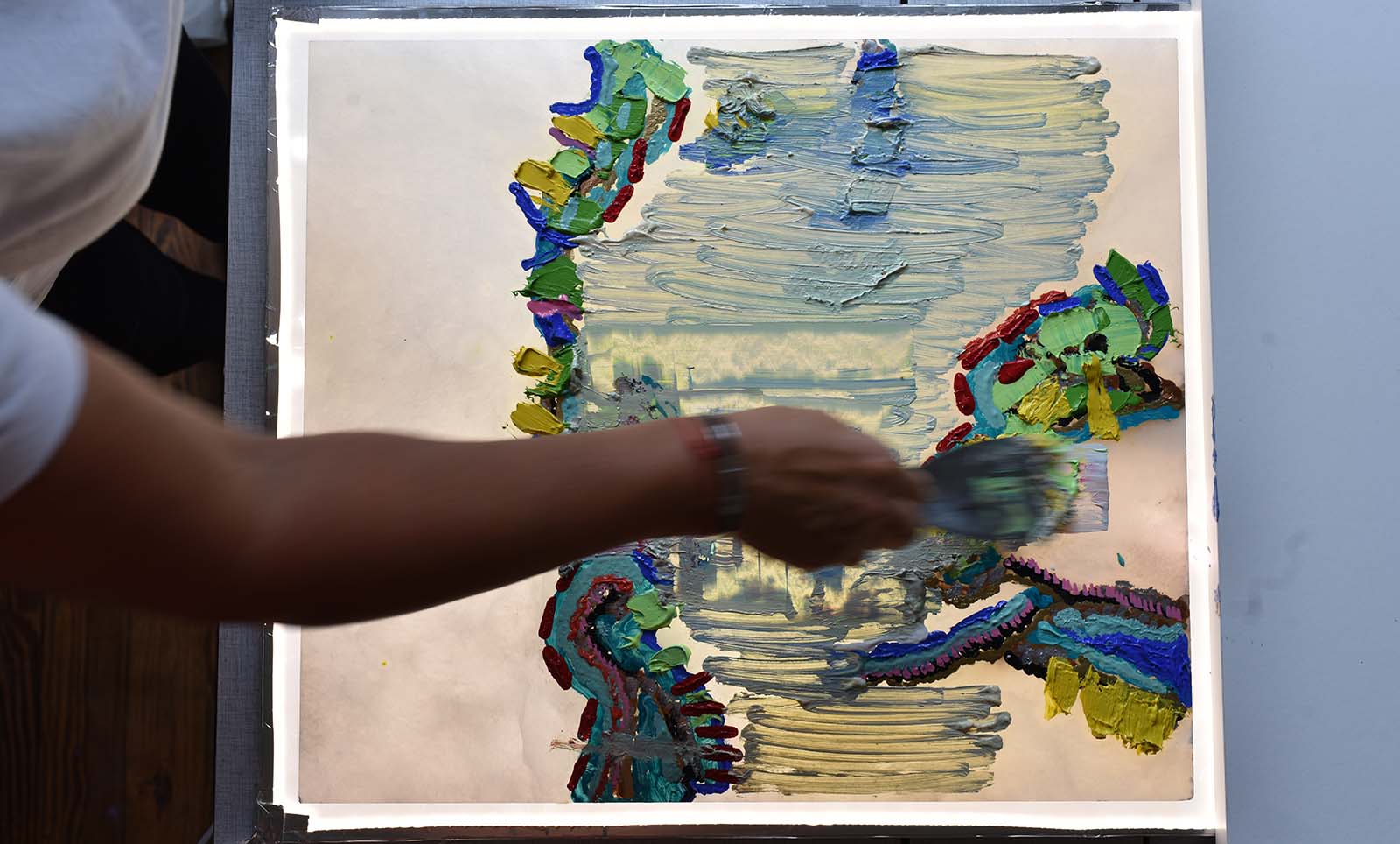 Réalisées à l’huile sur panneaux d’albâtre translucide, les œuvres se construisent par strates successives. La matière est déposée, raclée, interrompue. De larges lignes viennent structurer la surface comme des failles maîtrisées. Ce geste de rupture révèle la profondeur lumineuse de la pierre.