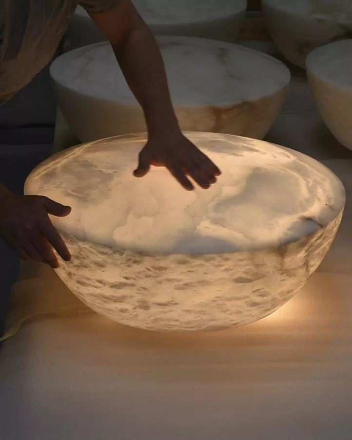Nos luminaires en albâtre sont conçus avec un savoir-faire exclusif, le Stonelight®, traitement développé et breveté par Alain Ellouz Paris en 2005. Cette innovation unique au monde renforce la pierre, la rendant plus résistante, garantissant sécurité et longévité.